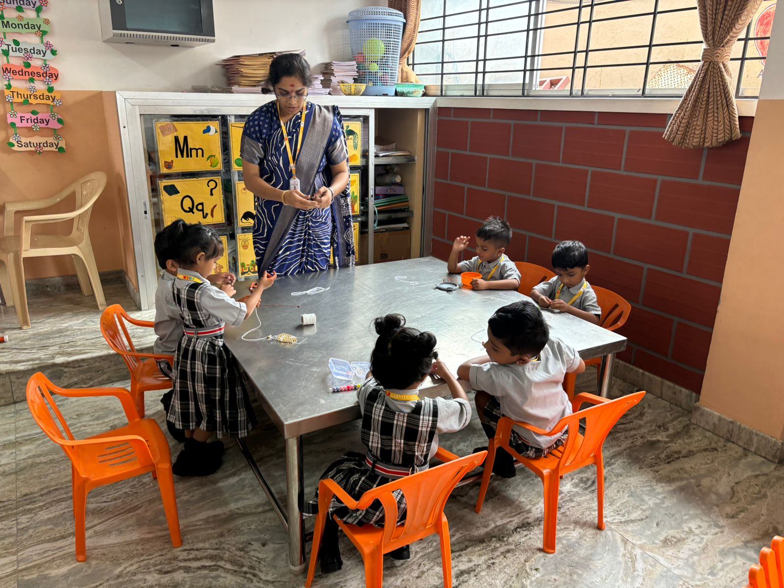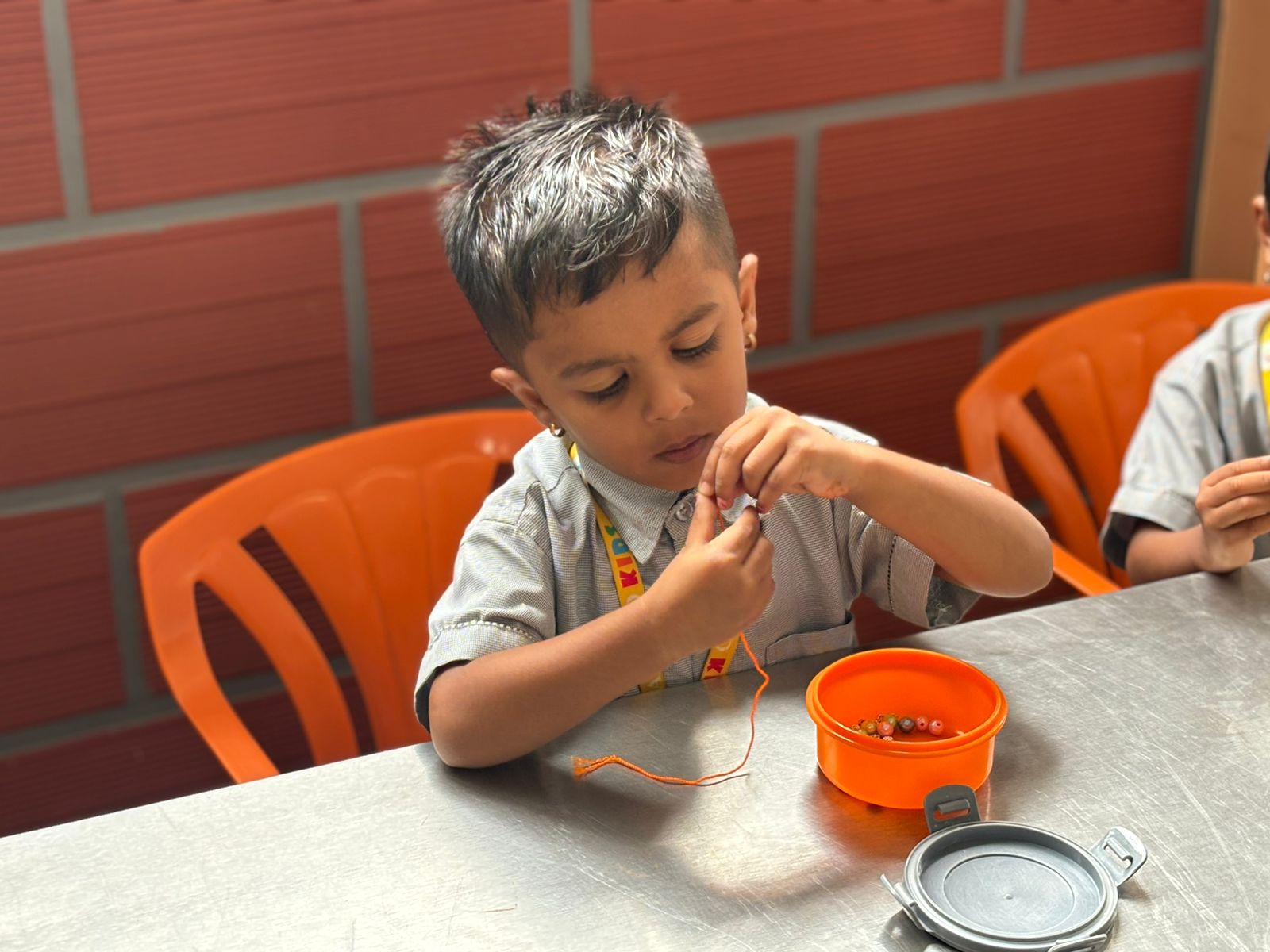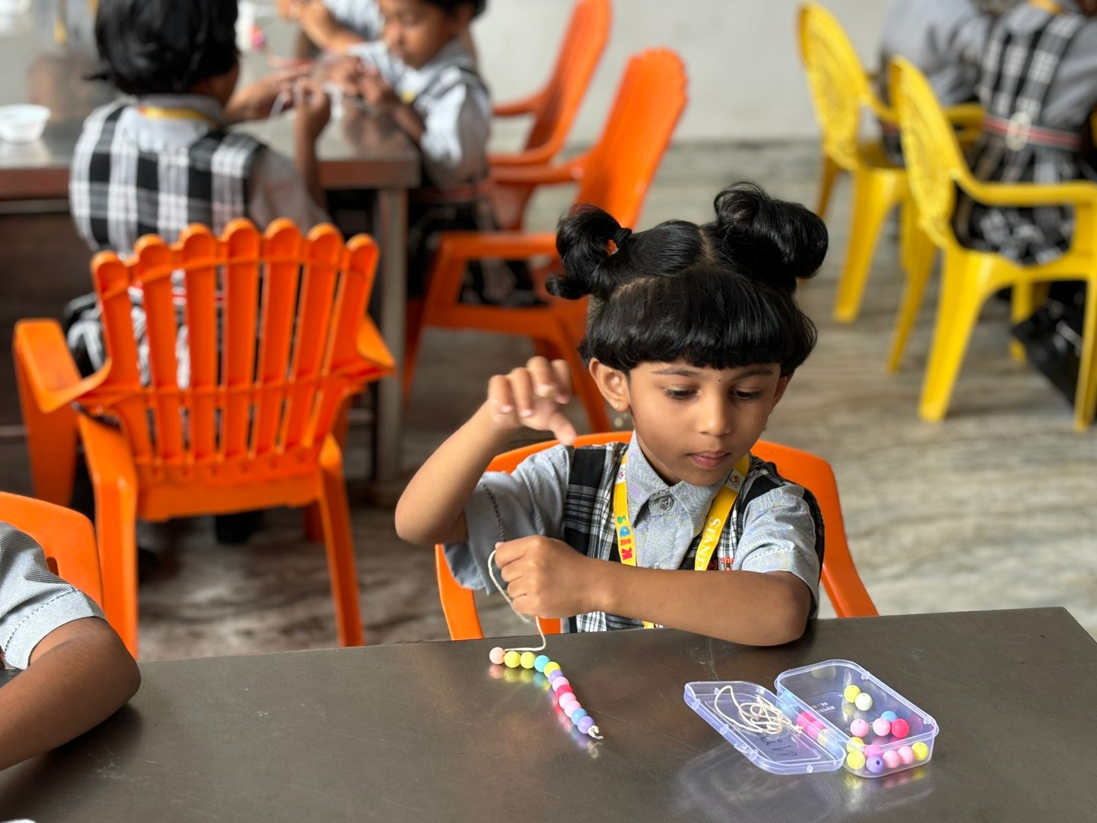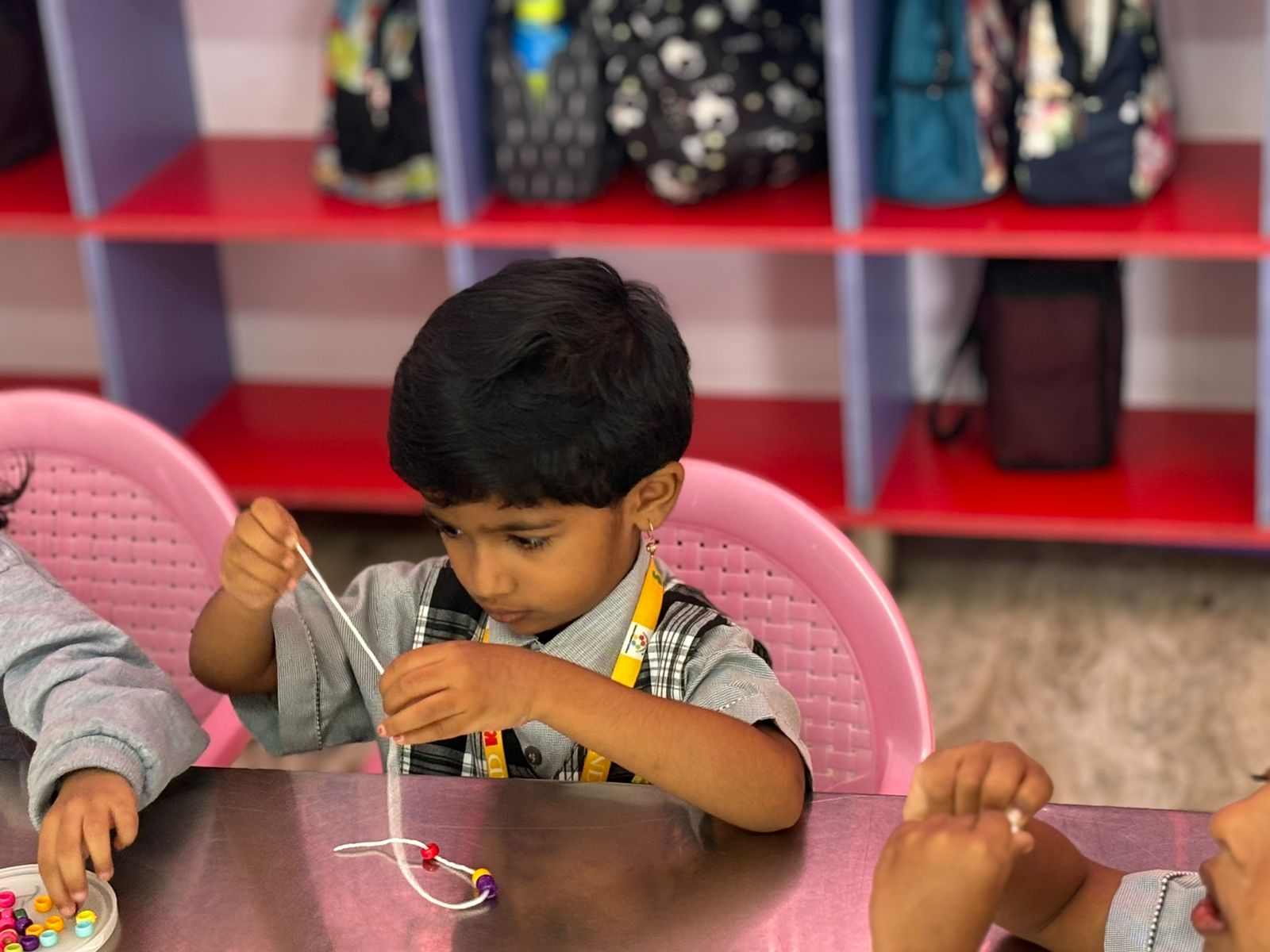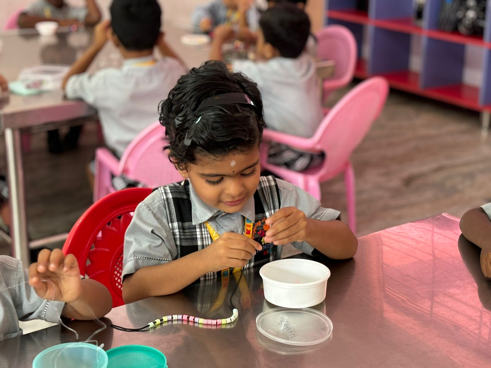 Through beading, children strengthened fine motor skills and hand-eye coordination. Picking up small beads, holding the lace steady, and sliding each bead into place built finger control needed for early writing. As they worked, teachers encouraged correct grip, calm breathing, and steady movements, helping children develop focus and stamina for longer tasks.