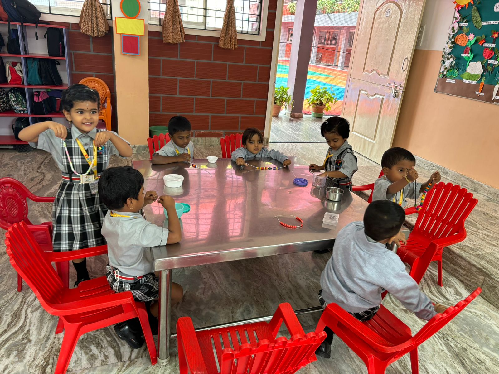 The activity also supported early math and language development. Children counted beads aloud, compared sizes, sorted colors, and created simple sequences like red-blue-red. They learned new words such as color names, circle, square, big, small, many, and few. When they shared their choices with friends, they practiced turn taking, listening, and speaking in complete sentences.